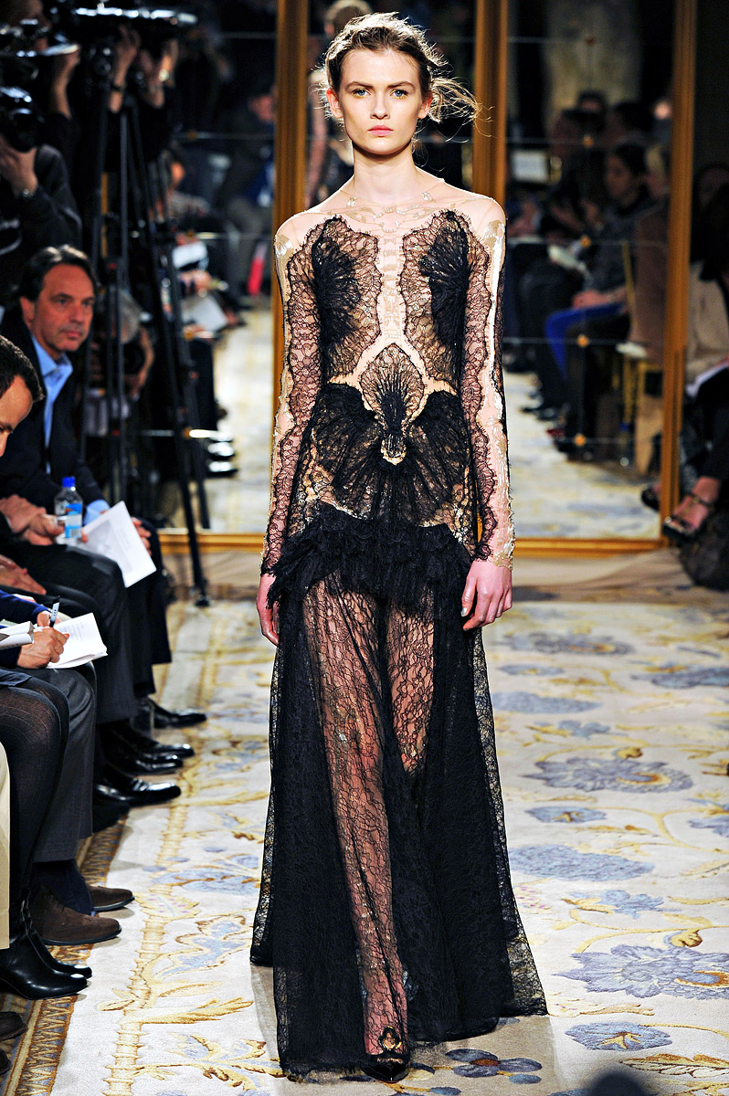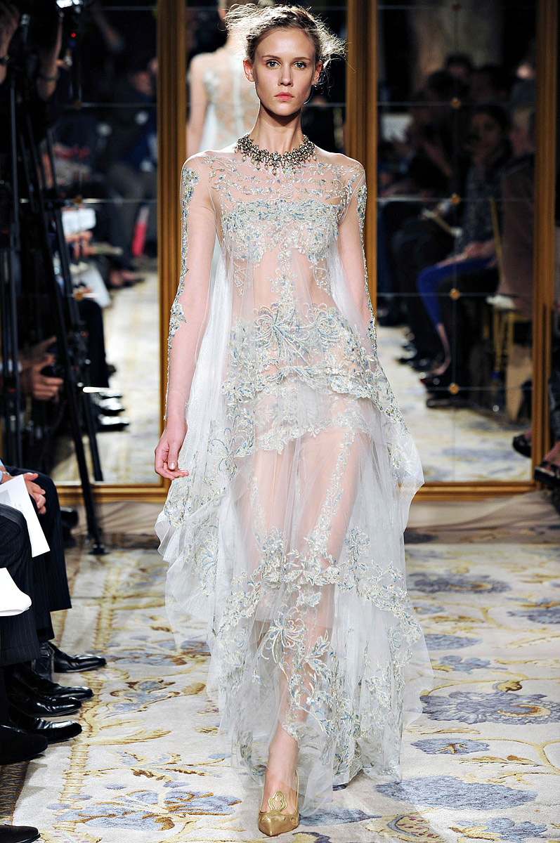 With a nineteenth century inspiration, embroidered tulles, amazing lace, and romanticism all over the place, the models in Vogue’s words “as a choir of angels” showed the gowns at the palm court of the Plaza Hotel.