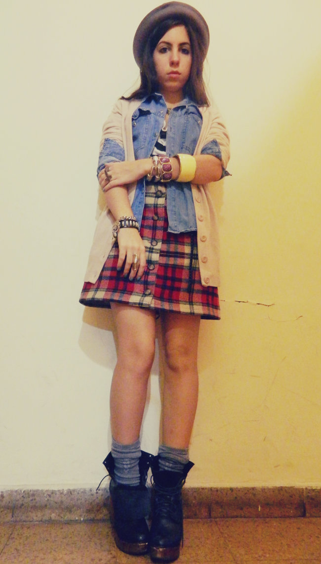 H&M hat, Forever 21 cardigan, Vintage denim shirt, United Colors of Benetton skirt, H&M striped shirt, no brand shoes or accessories.