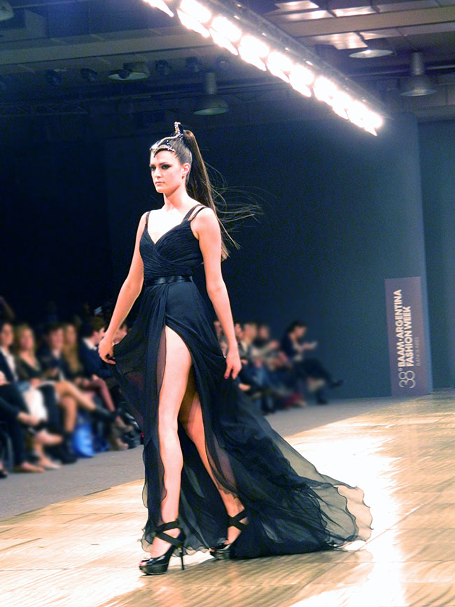 El último día del Buenos Aires Alta Moda estuvo muy concurrido, priméro porque abriendo la pasarela estaba en taller de tendencia de moda y maquillaje, algo muy interesante para aprender sobre qué es lo que se va a estar usando este invierno (resumiendo, militar, barroco, gotico y college) y segundo porque el cierre del evento estaba a cargo de Claudio Cosano. Pero veamos antes que nada lo que presento Susana Ortiz. Me imagino a mujeres trabajadoras, clásicas y elegantes , con algúnas reminisencias al new look de Dior en los cortes, las siluetas sin embargo eran variadas y distintas entre sí, pero con cohesión. Una paleta de colores fríos, y en tendencia, perfectos para el invierno como el azul con negro, bordeau y verde y el estampado por exelencia que no pasa de moda, el leopardo, formando así conjuntos que pueden servir para varios eventos formales y algunos ambitos profecionales.