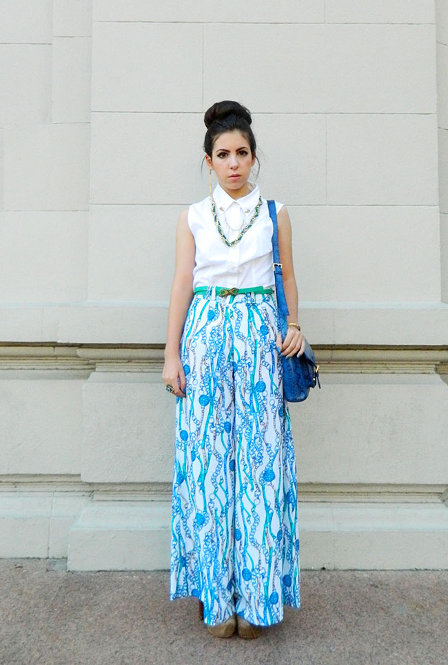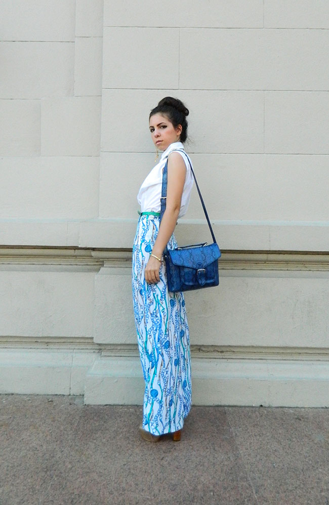 Segundo look. Casi la misma paleta de colores que antes pero sin rojo. Estos pantalones me los regaló mi mamá. Fui un día a una tienda y los vi, me encantaron pero no los pude comprar en el momento, días despues ella llegó con los pantalones. Es la primera vez que los uso, los estaba guardando especialmente para esto. Me encanta el estampado versacesco que tienen.