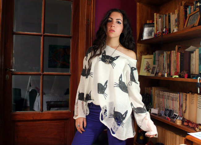Estoy usando este nuevo jumper de Romwe, me llegó cuando estaba de viaje y cuando volví el paquete estaba esperándome en mi cama. A que no es adorable? me gusta porque es liviano pero a la vez abriga lo suficiente. El estampado de los gatos y las roturas lo hacen mucho más genial. Lo usé con estos jeans azul eléctrico y esperen a ver los zapatos.