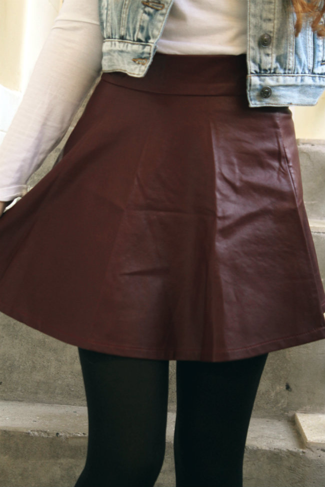 Let me tell you how many things you can do with this skirt. A leather piece is essential in every closet in my opinion, either a nice jacket, a vest or a skirt like this one. The red oxblood colour makes the look less hard, the shape adds that cute flirty look but the fact that the material is not very conventional for skirts, gives the edgyness. You can certainly match this skirt with tons of things and i intend to do so in many ocations to come, but this time i went for a day-time look by pairing it with white and a denim vest for the casual feel. Can you tell i’m not over the 90’s yet? i blame Rachel in the first seasons of Friends.