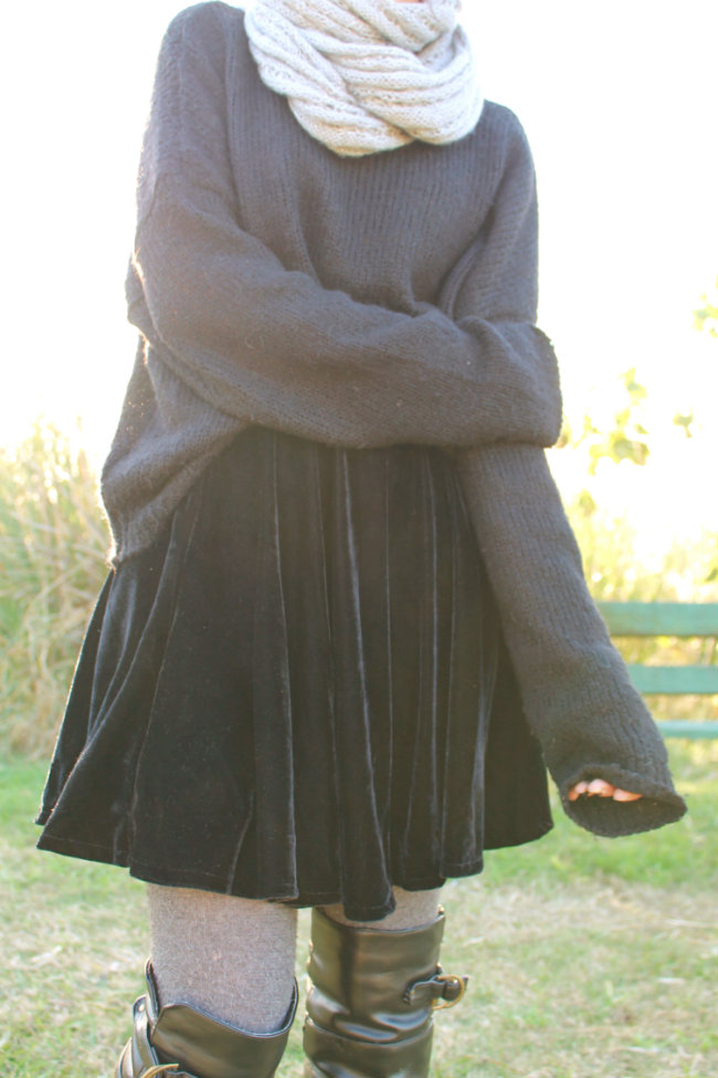 Breaking news! it is finally winter cold, and i’m not fan of wearing colours when i’m cold, i don’t know why i just don’t feel like it. I like deep and dark shades and black is always in, always a right choice, no matter where you have to go, what you have to do, it will be fine. I got this skirt in the mail and i wanted to wear it right away. Sometimes monochrome outfits can be boring, the trick lays in mixing textures and play with proportion to add dimension, here i have wool, velvet and leather, i would even add some fur to it too for that instant glam effect. Warm, chic and comfy is all i need in a winter outfit.