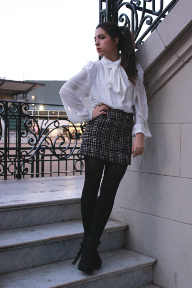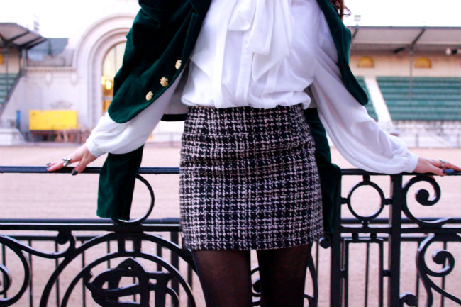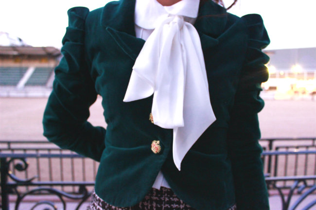 Esto es lo que usé para el último día de nuestro Fashion Week, tenía otra cosa planeada originalmente pero  luego vi esta chaqueta en mi armario y armé todo el conjunto con eso. No creo que la haya mostrado antes en el blog, algo raro considerando lo mucho que la amo! Todo el outfit me recordó a una mezcla entre Blair Waldorf y Cher Horowitz, saben? algo como una chica de clase alta en la Manhattan de los 90’s pero con algo moderno. El blanco y el negro nunca van a pasar de moda y es un clásico, le agregué un poco de color con mi tono de verde favorito en un terciopelo lujoso con botones de coronas, los mismos zapatos que usé el primer día porque son -sorprendentemente- cómodos y el pelo en una colita alta con bucles muy suaves. Un toque de rojo en los labios y mi satchel de CK, clásico y eterno.