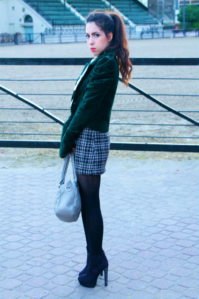 This is what i wore to the last day of our Fashion Week, i had other outfit planned but then i saw this jacket in my closet and built the whole thing around it. I don’t think i ever showed it to you, which is odd since i love it! The whole thing reminded me of Blair Waldorf and Cher Horowitz lovechild, you know, something like a 90’s posh Manhattan girl with a twist. Black and white is a classic and will never go out of style, added a pop of colour with my favourite shade of green jacket in a very lush velvet with crown buttons, the same shoes i wore the first day because they are -surprisingly- comfortable and my hair in a high ponytail with soft curls. A touch of red in the lips and my CK satchel, simple yet timeless.