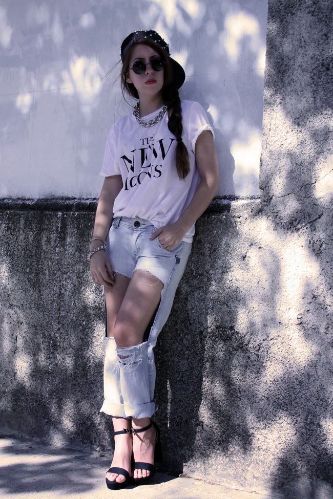 We all have those days where we stand in front of our closet, looking clueless and thinking “i have nothing to wear at all” even though, at least in make case, there is literally no more room for anything else, what we trully mean is “i have nothing that represents the mood i am in at the moment” nothing you have looks right. You can try on ten different outfits and in the end, go back to the plain old white shirt and pair of jeans. But still in those basic pieces we all have, kind of the saviour items you can always reach in need, the foundations of one’s closet, if you will, those boring garments can be jazzed up when styled right. Instead of a plain shirt, look for a graphic one with a nice print or logo, jeans with cut outs or rips tend to look way cooler than regular ones and always add accessories that will define the tone of the outfit. In this case, i was looking for a chic-urban vibe so i paired the silver jewellery and studded hat with those minimal sandals from Jessica Buurman. These pants were totally inspired by one of my style muses,