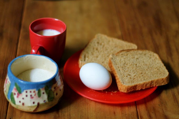 4-Corten el pan a la mitad y humedezcanlo con leche primero y luego en el huevo de ambos lados.