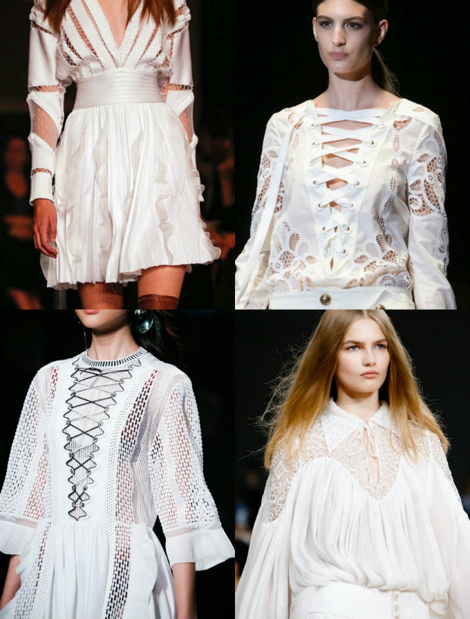 Mis elegidos personales para esta temporada siguen siendo el blanco y el negro. Recortes con laser, detalles en encaje y bordados vistieron las pasarelas de Nueva York a Paris. Si hablamos de formas hubo una batalla entre los vestidos vaporosos y boho-ish verus las prendas ajustadas y con estructura. Las faldas por arriba de la rodilla y los crop tops fueron estrella en muchos de los shows junto con el maquillaje natural y cabellos simples en la parte de belleza.