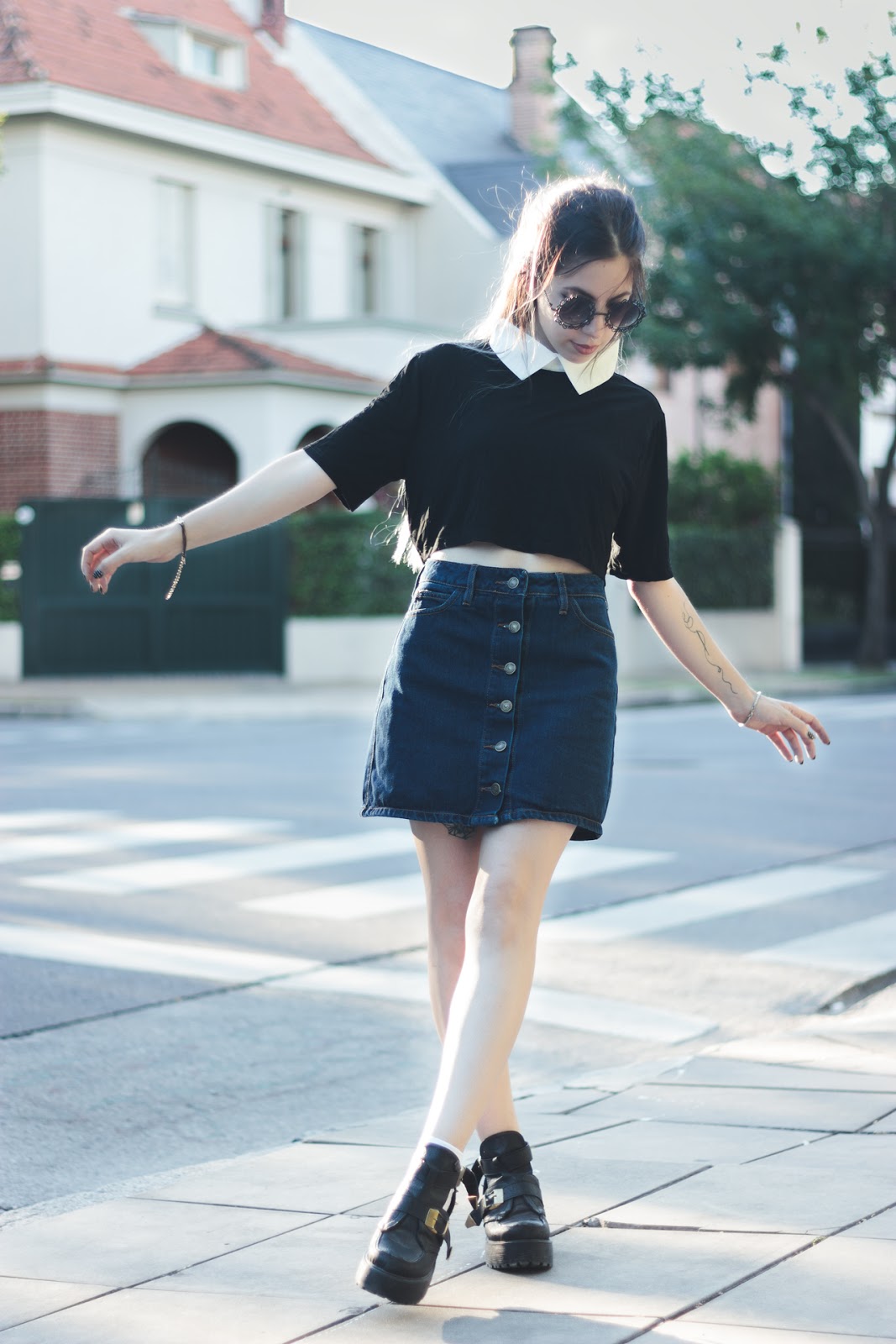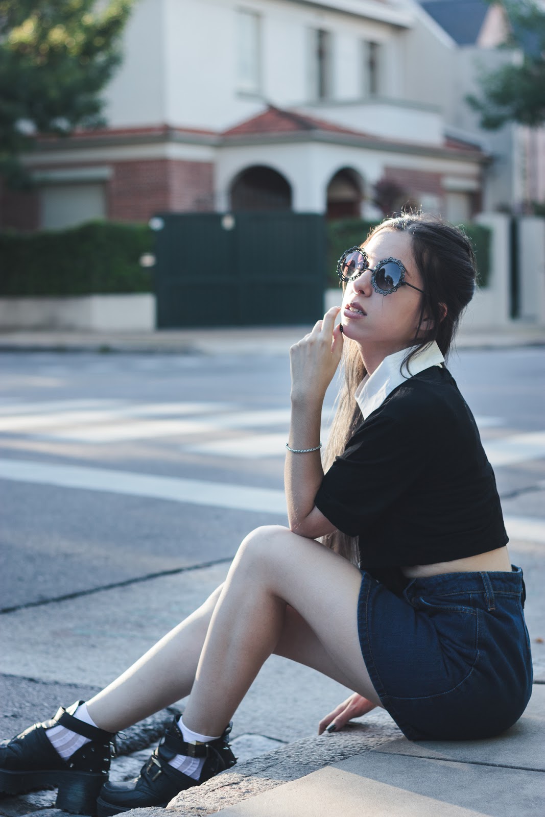 No se si se acuerdan pero en Julio del año pasado, en –este post– hablaba sobre lo obsesionada que estaba con las faldas abotonadas. Unos meses después conseguí una y hasta ahora no se las había mostrado! La combiné con un crop top que me llegó hace unas semanas de YOINS que me encanta porque tiene el detalle del cuello en blanco. Como siempre, los accesorios son los detalles que cierran el conjunto por lo que elegí estos lentes redondos de GoldSoul y para seguir con la paleta de colores y la onda monocromática (obvio) zapatos negros y soquetes blancos. El resultado es un outfit que me hace pensar en cher horowitz meets wednesday addams, no se. Pero me gustó mucho.