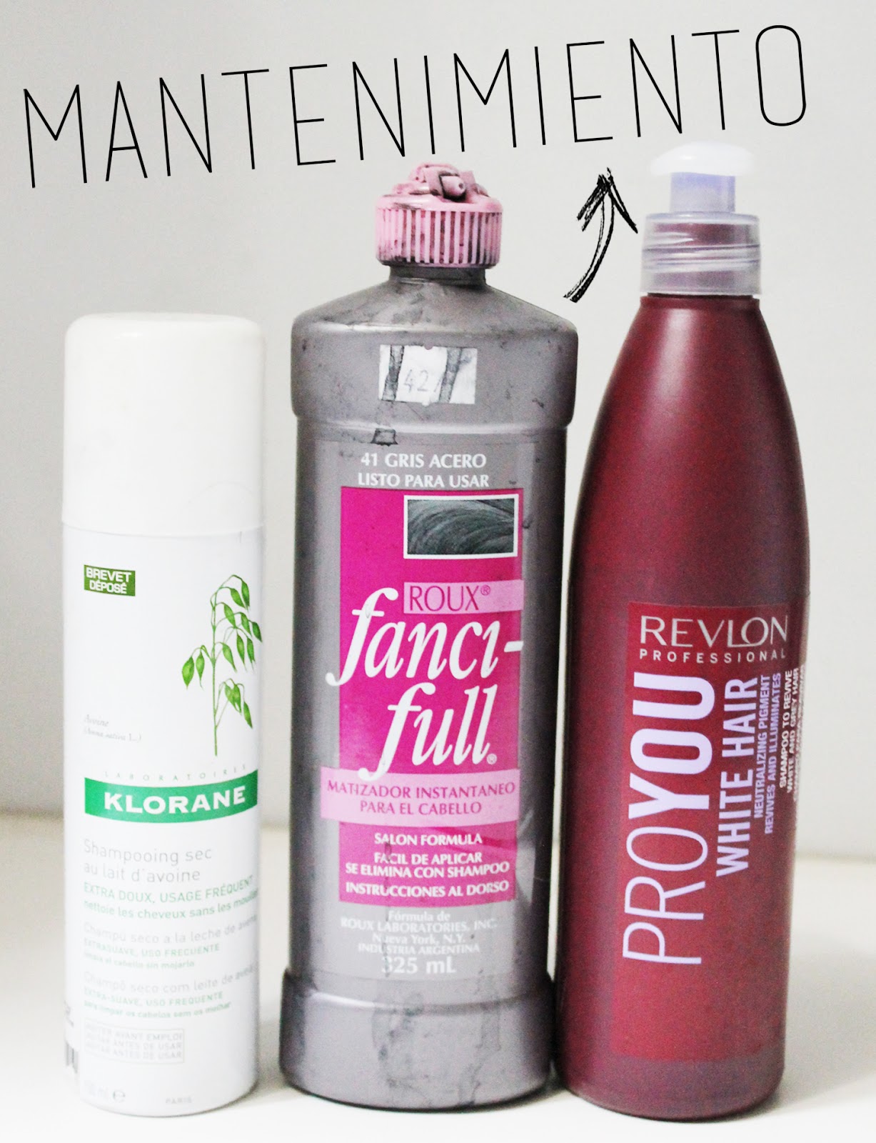 - Fancy Full de Roux en 41-gris acero. Es un matizador instantaneo que deja el pelo gris ni bien lo aplicas y se va con los lavados. Lo que hago es aplicarlo, dejarlo unas horas y luego lavarlo para quitar el exceso. Baja varios tonos de color pero mantiene el color perfectamente sin necesidad de teñir o volver a decolorar.