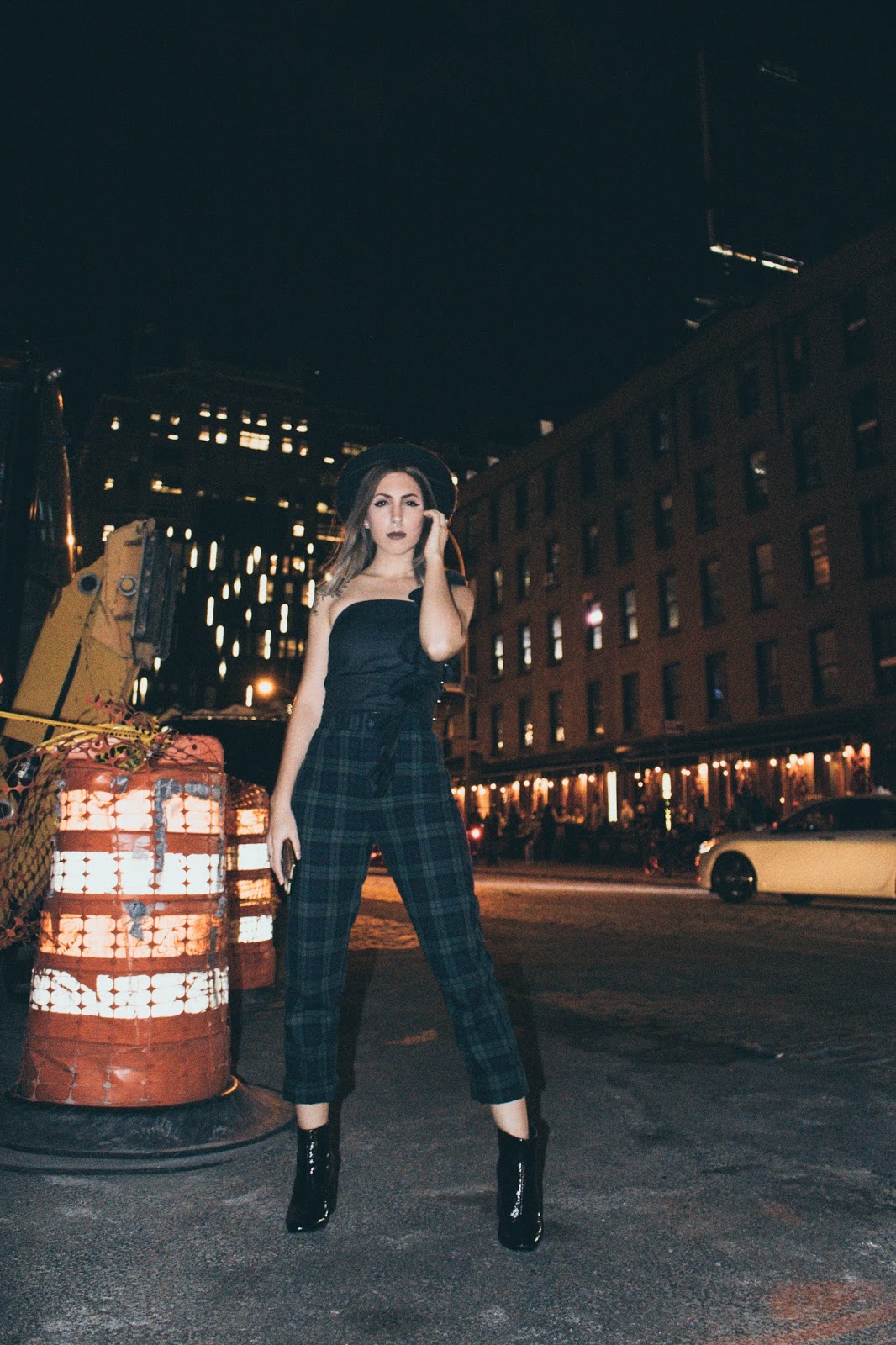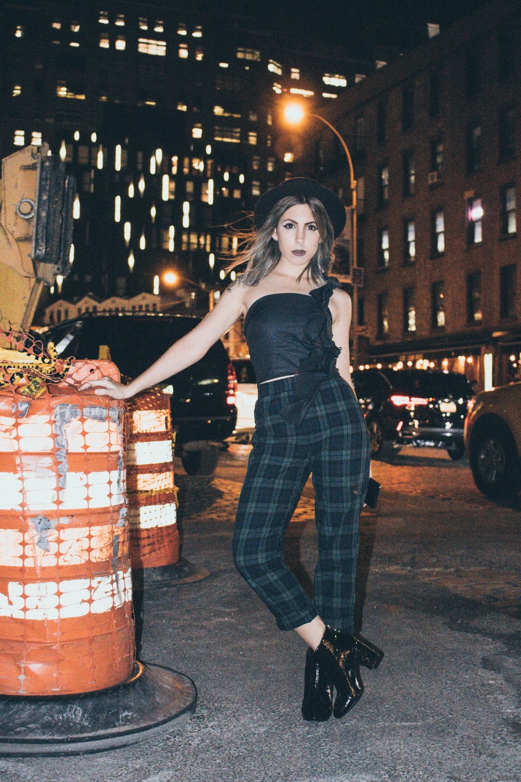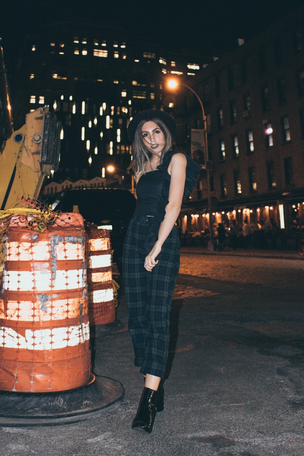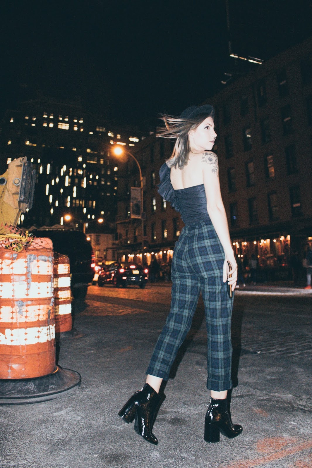 No suelo mostrar muchos looks de noche por acá simplemente porque no tengo la cámara a mano. Pero estando allá la cámara estaba conmigo 24/7 y pudimos hacer estas fotos luego de la fiesta de Samsung x WWD. Ese día como van a ver en el vlog en unos días, decidimos quedarnos trabajando a la mañana y luego ir directamente a las fiestas que teníamos a la noche.  Me puse este top que me lo hizo la diseñadora Toba Reyes junto a otro que van a ver en otro post. Ella hace alta costura y se ofreció muy amablemente a hacerme unos tops a medida para que me lleve al viaje. Este tiene un volado hermoso en el hombro que no se puede apreciar mucho por ser de noche pero igualmente seguro use en otro momento. Los pantalones de tartan que no son ni blanco ni negro ni gris (!!) los compré en Brandy Melville  y las botas, bueno, ya las vieron en varios looks y las van a seguir viendo porque obviamente como ya dije, no llevé mil pares de zapatos.
