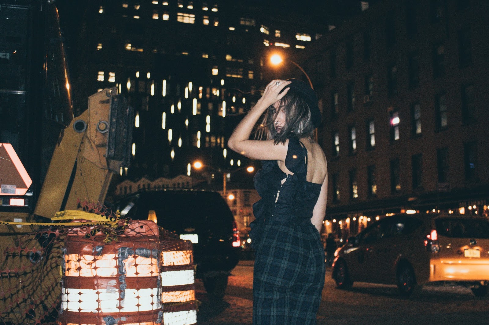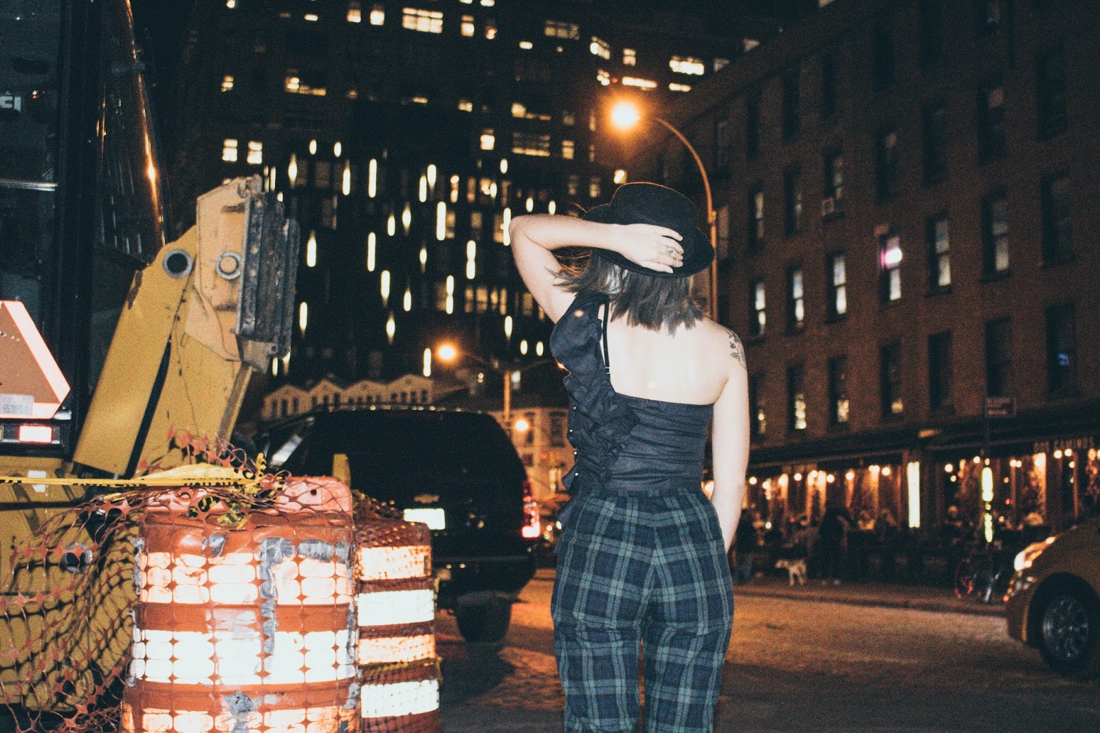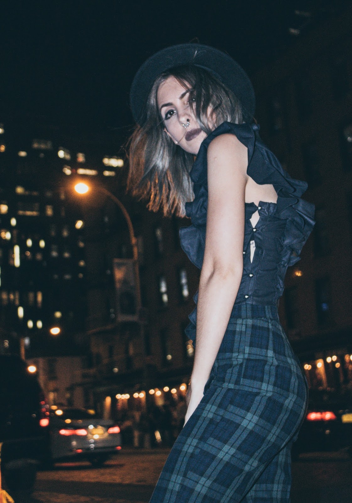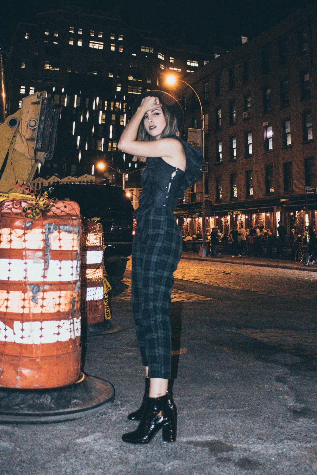 No suelo mostrar muchos looks de noche por acá simplemente porque no tengo la cámara a mano. Pero estando allá la cámara estaba conmigo 24/7 y pudimos hacer estas fotos luego de la fiesta de Samsung x WWD. Ese día como van a ver en el vlog en unos días, decidimos quedarnos trabajando a la mañana y luego ir directamente a las fiestas que teníamos a la noche.  Me puse este top que me lo hizo la diseñadora Toba Reyes junto a otro que van a ver en otro post. Ella hace alta costura y se ofreció muy amablemente a hacerme unos tops a medida para que me lleve al viaje. Este tiene un volado hermoso en el hombro que no se puede apreciar mucho por ser de noche pero igualmente seguro use en otro momento. Los pantalones de tartan que no son ni blanco ni negro ni gris (!!) los compré en Brandy Melville  y las botas, bueno, ya las vieron en varios looks y las van a seguir viendo porque obviamente como ya dije, no llevé mil pares de zapatos.