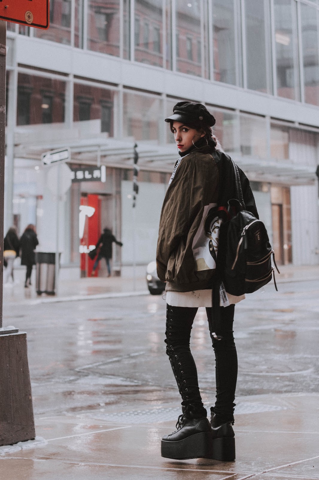 Mezclé varias cosas que me gustan mucho y sé que van a ser mis items principales en invierno: los sweaters enormes y los baker boy hats. Este lo compré en la liquidación de Zara y salió nada más que 15 usd! Amo las rayas en blanco y negro por lo que no podía no llevarlo. Siempre que usen algo bien holgado en una parte, lo mejor es usar algo ajustado en la otra para balancear las proporciones. Obvio que siempre se puede ir H-TO-T oversized pero eso es brujería del styling. Como llovía le agregé una campera de Romwe que compré hace varios meses y tiene dos colores y una estampa en la espalda que me parece super interesante. Los pantalones con cordones son un extra de textura para no usar jeans básicos negros y ya.