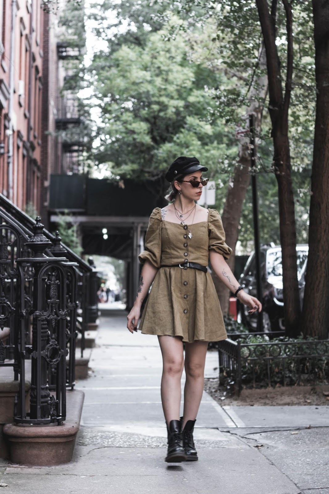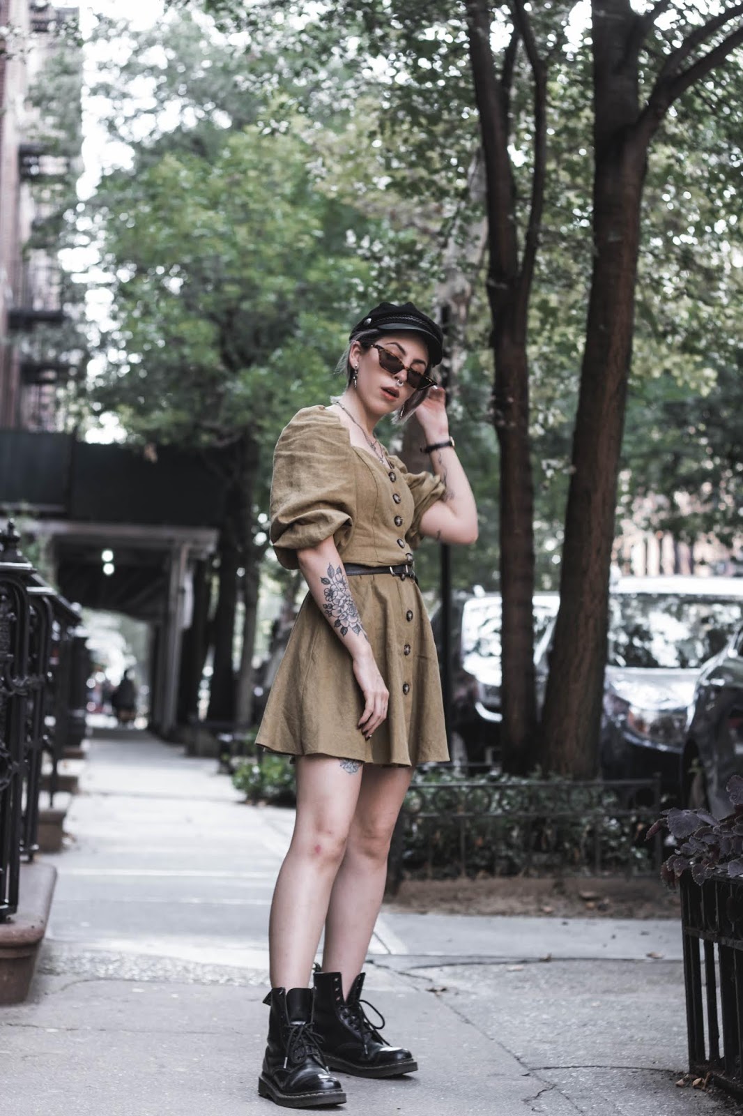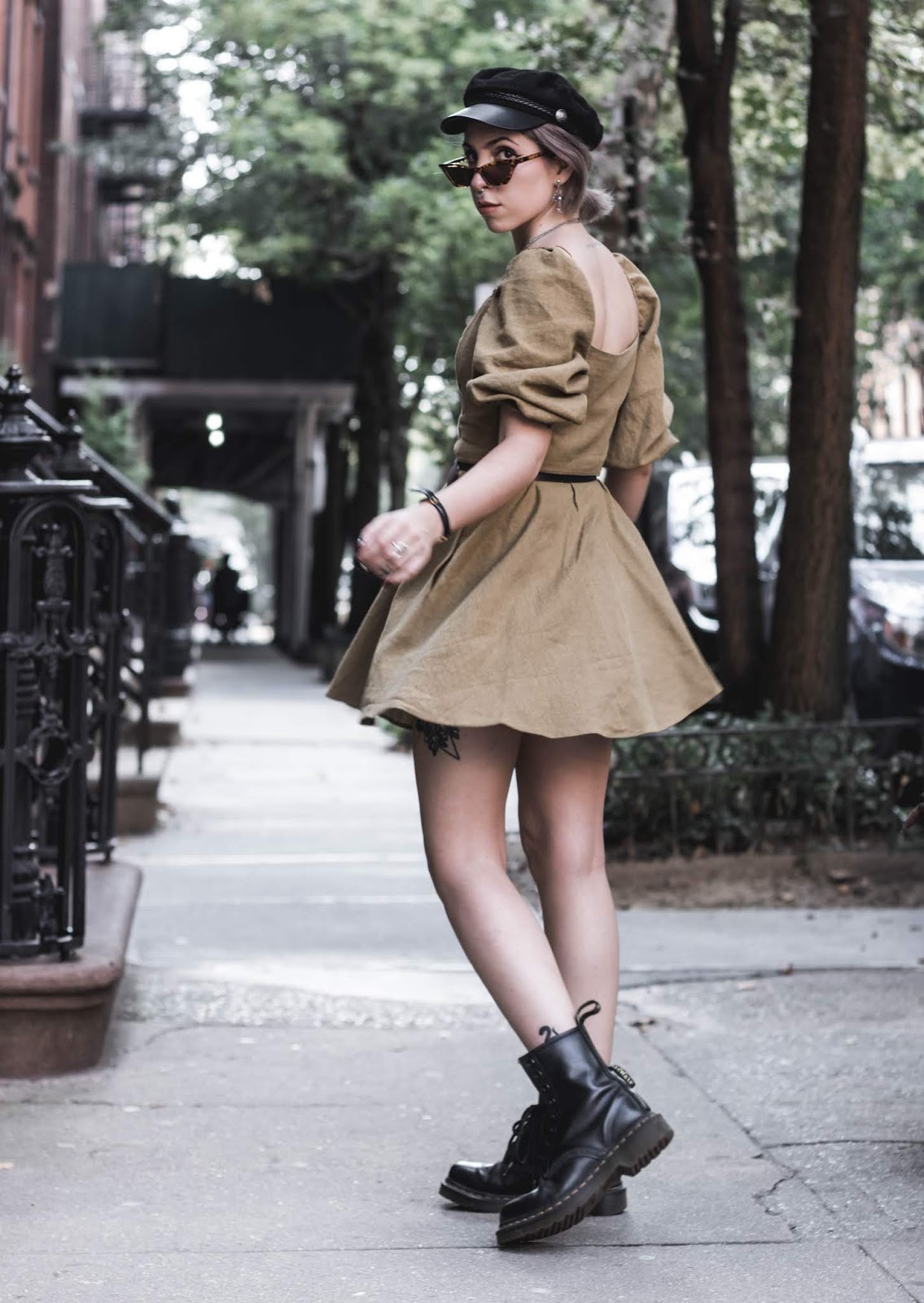 Cuando llegué a NYC y fui a Zara, lo primero que hice fue buscar este vestido y así me conquistó el corazón. Lo combiné con accesorios un poco más grunge como la boina y los docs para hacer un poco de contraste (y además amo los vestidos con botas).