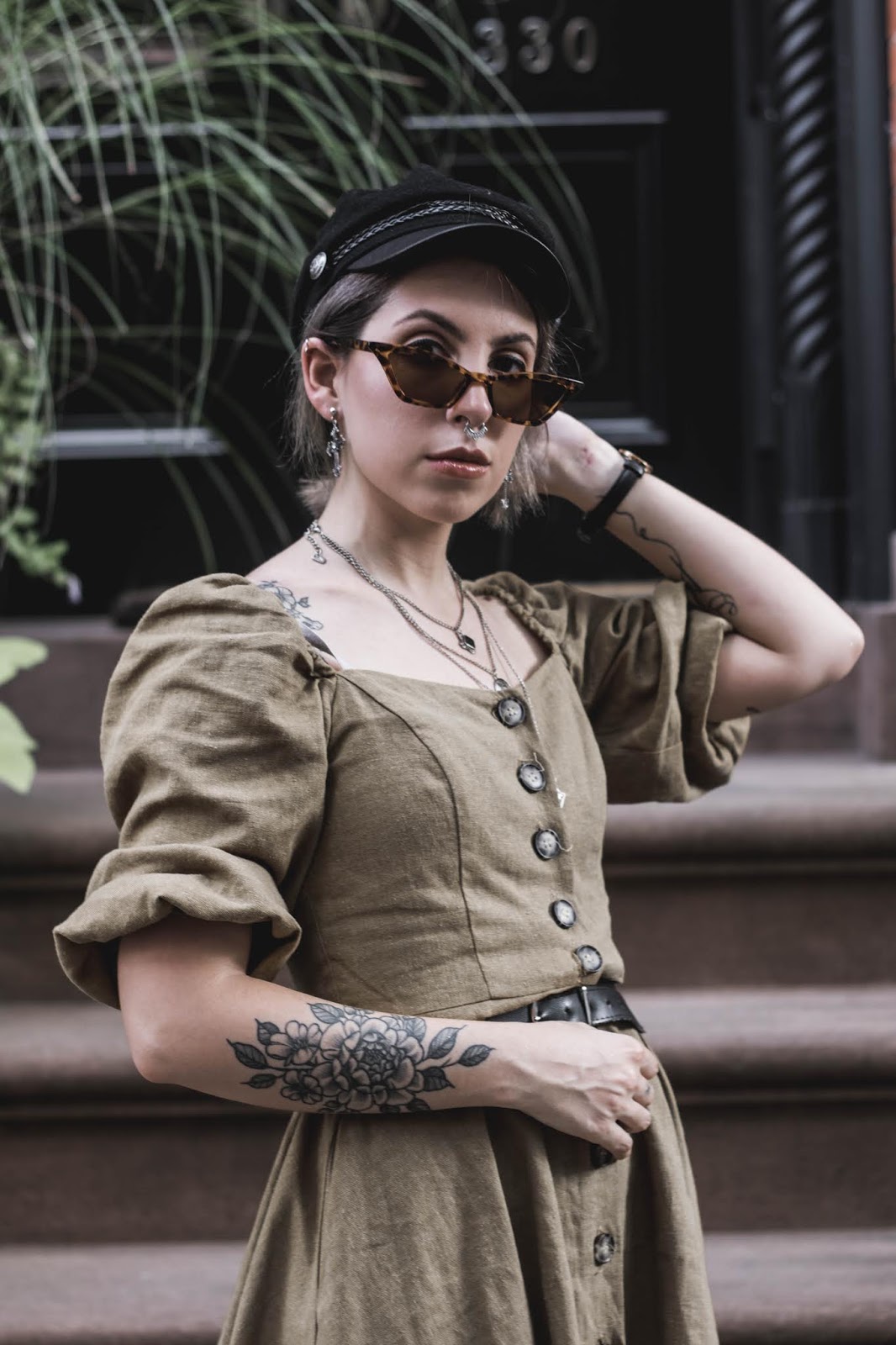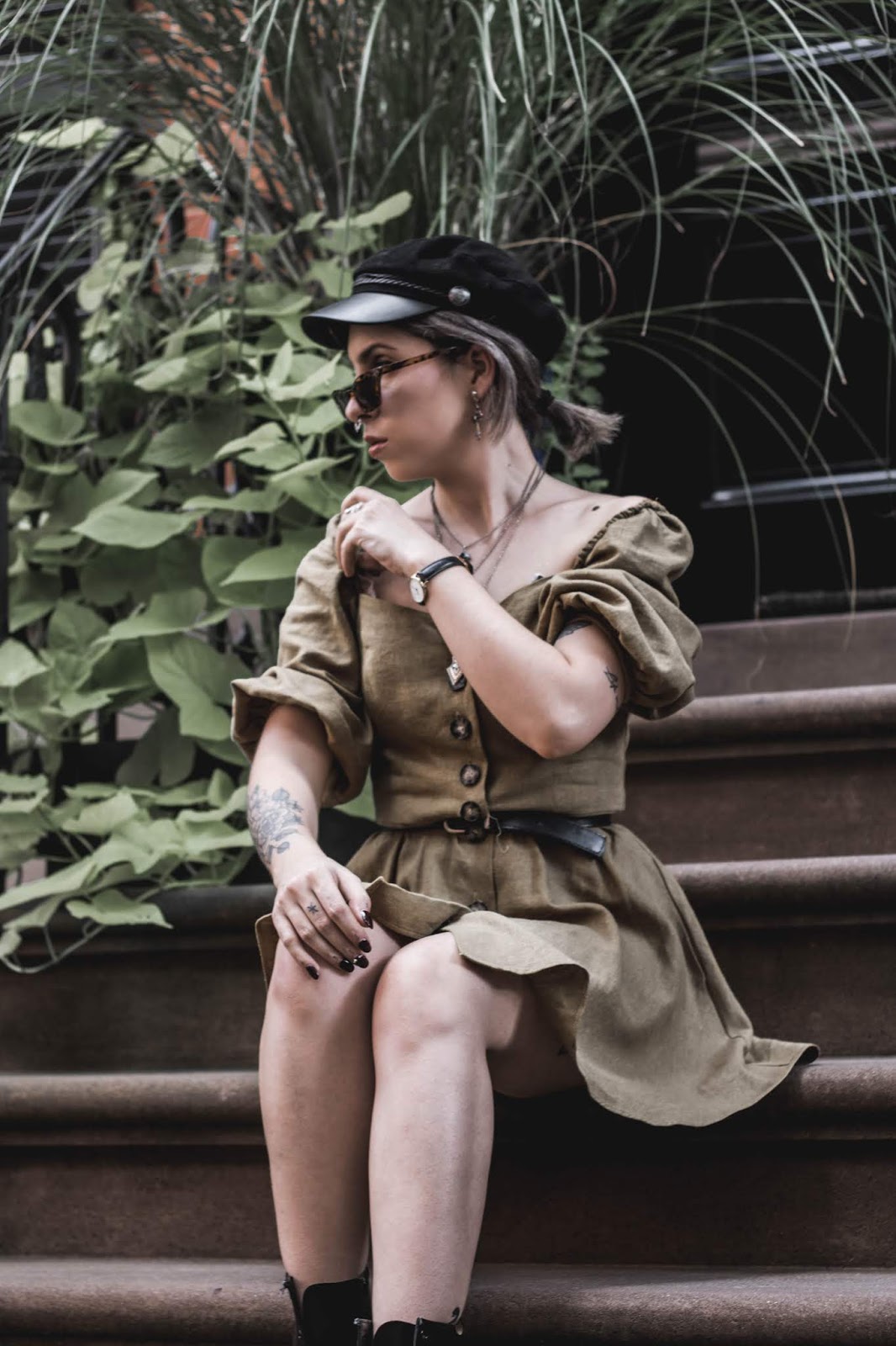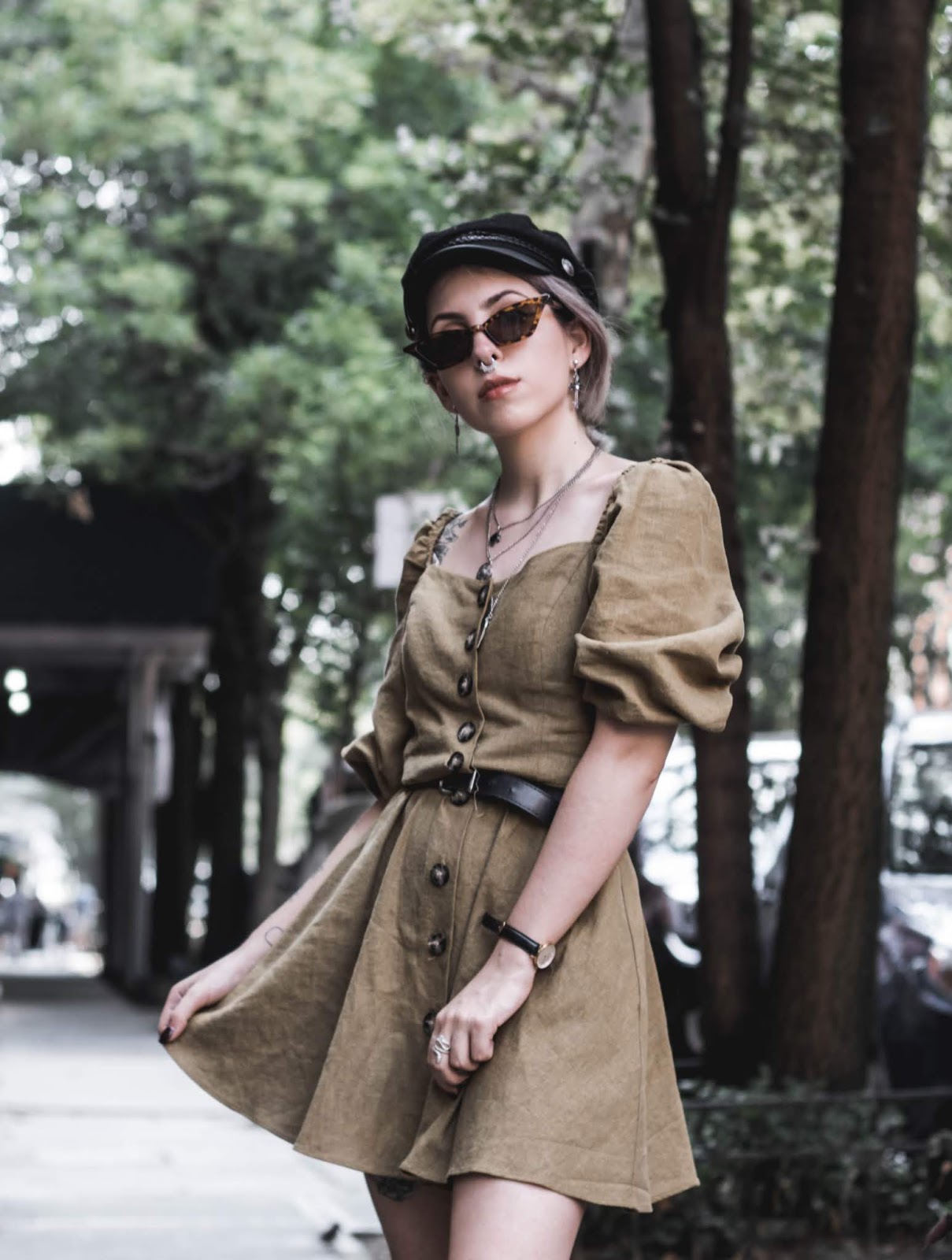 Cuando llegué a NYC y fui a Zara, lo primero que hice fue buscar este vestido y así me conquistó el corazón. Lo combiné con accesorios un poco más grunge como la boina y los docs para hacer un poco de contraste (y además amo los vestidos con botas).