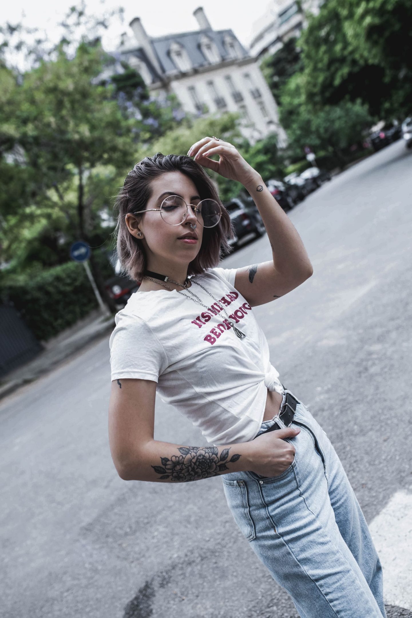 La segunda idea es mi go-to outfit con mom jeans, una remera estampada y los doc martes. Me gusta como con nada más otros zapatos la vibra del pantalón es otra. Até la remera para darle más definición a la cintura y marcarla. Si te animás, podés usar una campera de jean en otro tono de azul para el clásico denim on denim. Una camisa escocesa atada a la cintura también es un toque 90s que creo iría muy bien.
